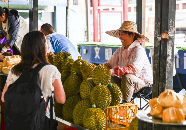 2023年5月18日,越南果商在中国广西东兴售卖榴莲。