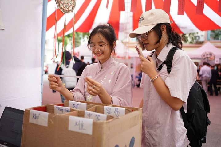 2023年11月1日,越南大学生在河内大学“同唱一首歌”中国—东盟青年影视歌会活动现场参与猜谜语游戏。