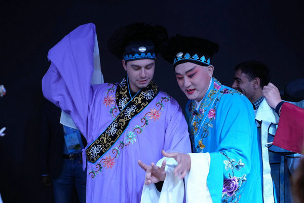 An expat learns about the opera's gestures on stage. [Photo provided to chinadaily.com.cn]