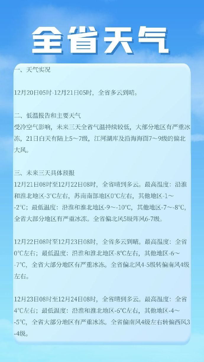 12月21日08时至12月22日08时,全省晴到多云。最高温度:沿淮和淮北地区-3℃左右,苏南南部地区0℃左右,其他地区-1~-2℃;最低温度:沿淮和淮北地区-9~-10℃,其他地区-7~-8℃,全省大部分地区有严重冰冻。全省偏北风5级阵风6-7级。