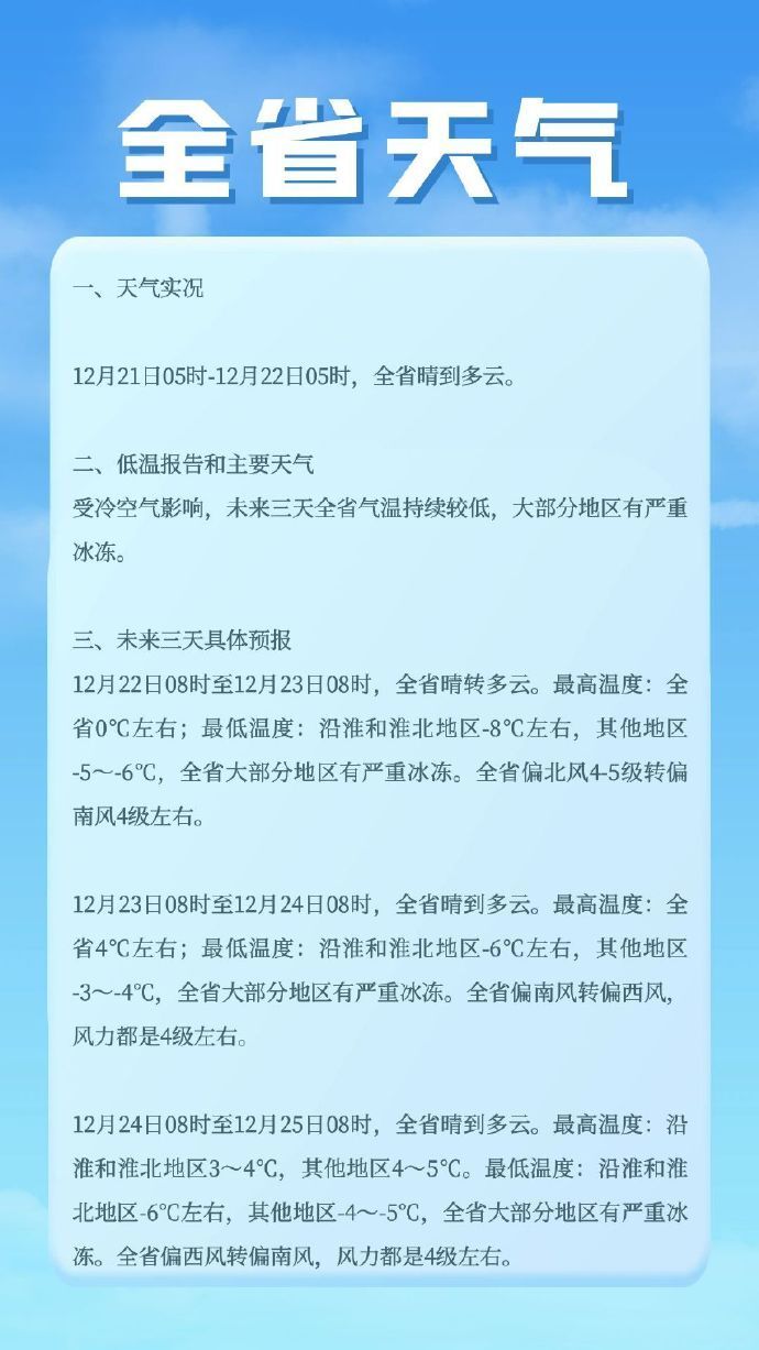 12月22日08时至12月23日08时,全省晴转多云。最高温度:全省0℃左右;最低温度:沿淮和淮北地区-8℃左右,其他地区-5~-6℃,全省大部分地区有严重冰冻。全省偏北风4-5级转偏南风4级左右。