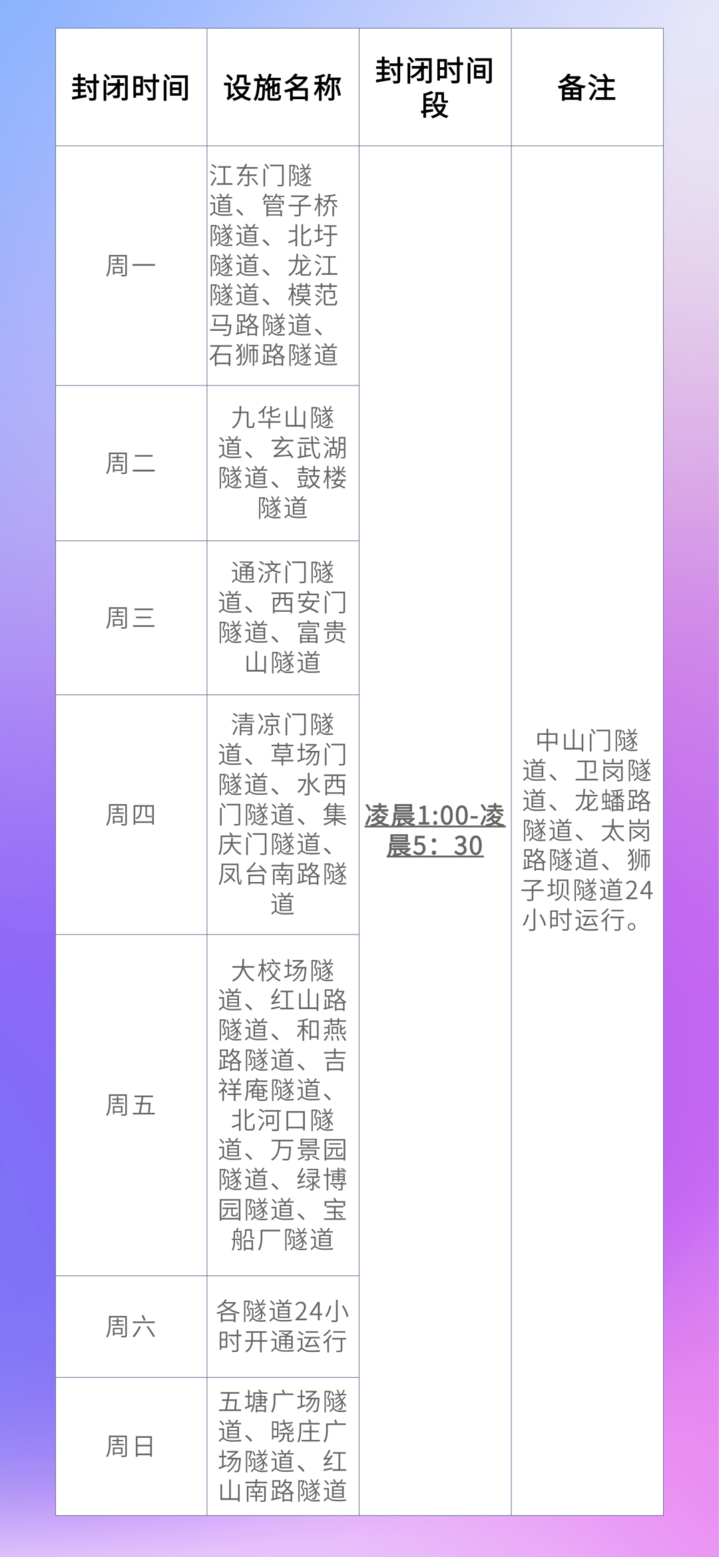 2.周一“江东门隧道、管子桥隧道、北圩隧道、龙江隧道、模范马路隧道、石狮路隧道”凌晨1:00-凌晨5:30封闭维护,其余隧道24小时开通运行,以此类推。