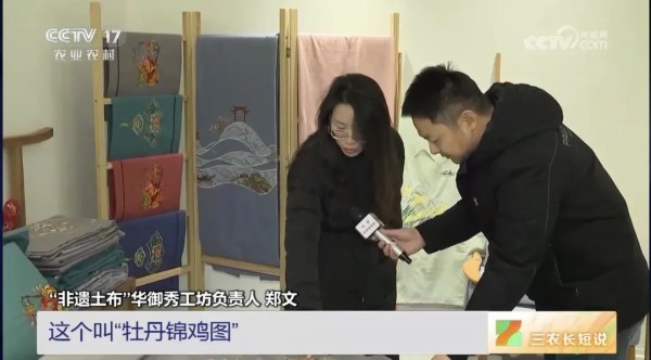 随着当地推进现代家纺全产业链建设,企业也从材料和设计等方面开展创新。比如这家企业就致力于聚乳酸纤维在纺织领域的应用,开发出多种不同功能的纺织产品。另一家企业则将传统土布元素融入到设计中。“像这个蒹葭就是出自《诗经》,这个叫‘牡丹锦鸡图’,出自国画的一种风格。”“非遗土布”华御秀工坊负责人郑文介绍。