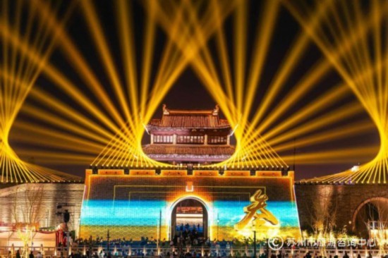 灯光秀重点突出古城多元而深厚的文化底蕴,用潮流光影再现古城繁华,让广大市民游客在历史文化与现代科技的梦幻联动中感受姑苏魅力。