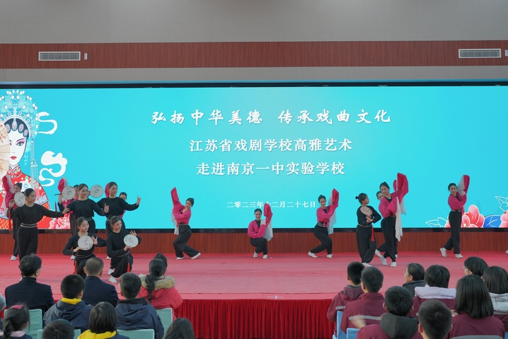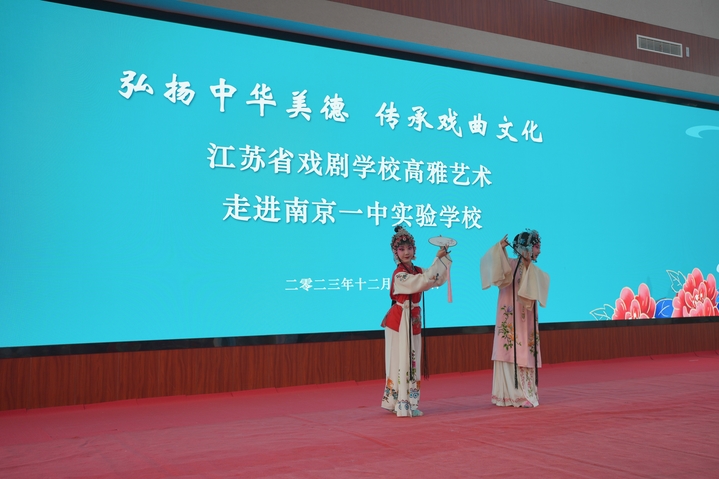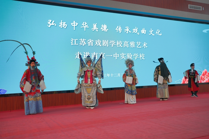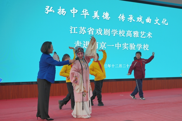 我苏客户端讯 12月27日下午,江苏省戏剧学校“戏曲进校园”活动走进南京一中实验学校,为该校近千名师生奉上视听盛宴。省戏剧学校校长李全、副校长许亚东,南京一中实验学校董事长曹小竹,校长尤小平,执行校长黄侃、初中部副校长李敏等出席活动。