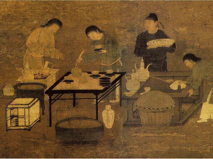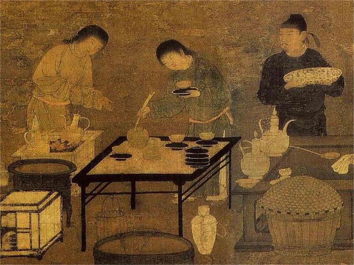 宋代茶饮的主要原料延续唐代工艺,但更为精致,一是去苦增甜,二是从气派的“大饼”变身精致的“小团”。宋人烹茶使用的是点茶法,和唐代煮茶法最大的不同之处在于不再“煮”,而是“点”,即将茶粉调成茶膏放在茶盏里,一边注开水,一边搅动,直至表面泛起大量沫饽(雅称“乳花”)。为保证原汁原味,点茶法不加盐。