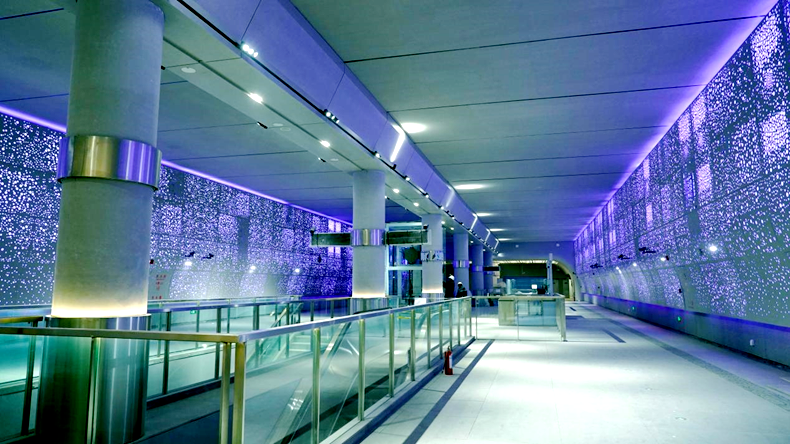 车站整体造型融合装配式理念,采用透光合金钢板、混凝土挂板,巧妙运用空间肌理和色调搭配,营造出简约朴素的质感。同时,通过灯光变换,表现出城市过去、现在和未来的繁荣景象,呈现了古今人文与自然的共生交融关系。