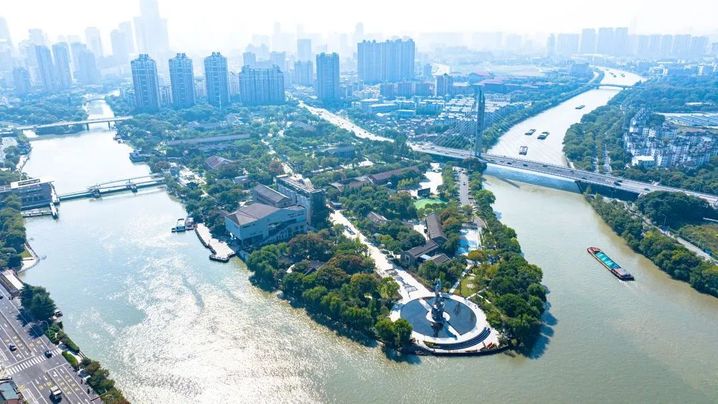 从空中俯瞰焕新后的运河艺术公园,“渔之颂”雕塑挺立在京杭大运河和环城古运河交汇处,四周圆盘镜面水景犹如荡漾运河之上的一面水镜,步道环绕、景致叠加、绿荫葱郁,保留历史风貌的建筑经过精心翻修,流淌着艺术气息。