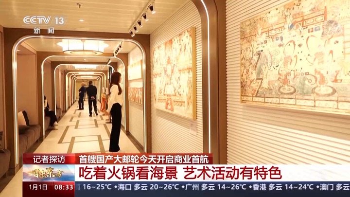 总台央视记者 吴天白:在邮轮上还有一处艺术长廊非常吸引观众的目光,沿着4甲板一直走,我们就来到了邮轮和敦煌研究院一起合办的《念念敦煌》艺术展。此次艺术展精心挑选了16幅经典的敦煌壁画。
