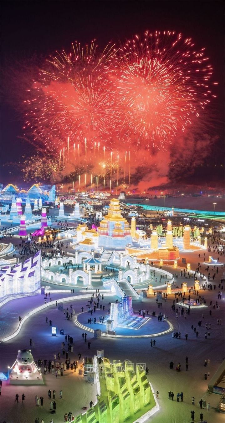 记者了解到,12月31日晚19时,哈尔滨冰雪大世界燃放烟花,进行了烟花秀表演。美轮美奂的烟花在炫彩的冰雪大世界上空燃放,为2024年的到来喝彩。