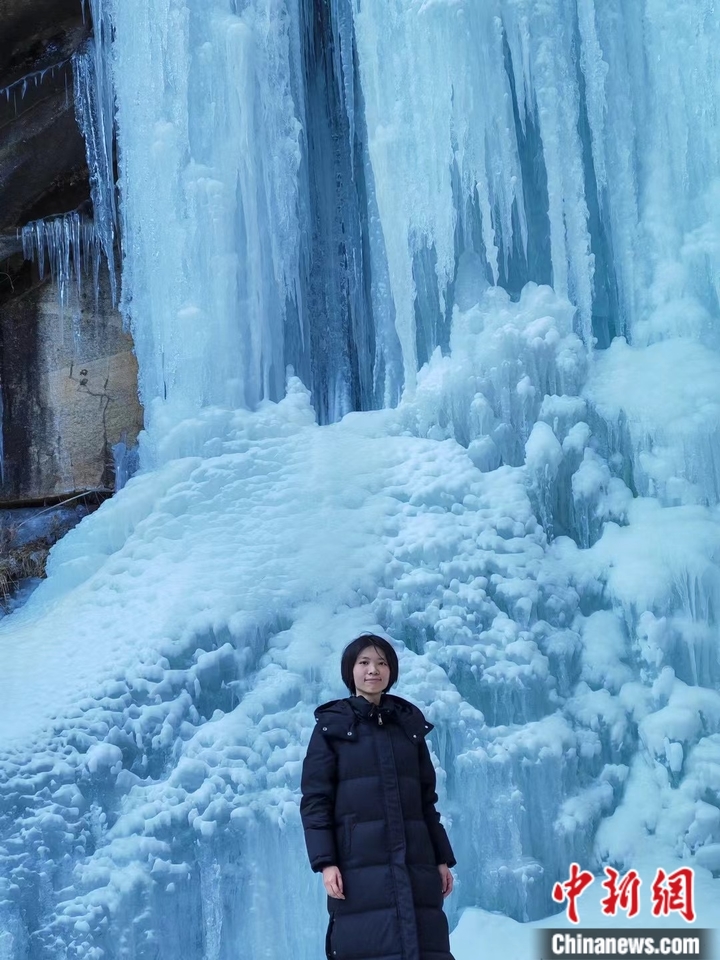 图为北京大学台湾交换生谢茵在密云的冰瀑前留念。(受访者供图)