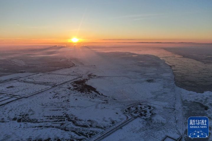 这是1月1日在辽宁省盘锦市中国石油辽河油田拍摄的日出(无人机照片)。新华社记者 潘昱龙 摄