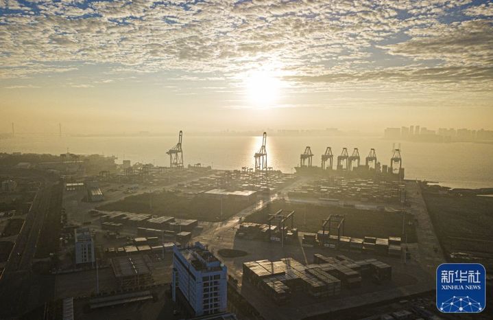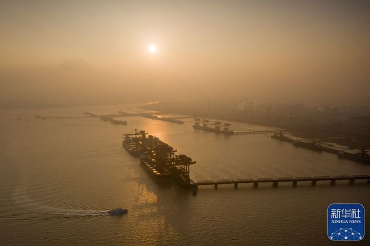1月1日,在新年第一缕晨光里,浙江省宁波舟山港北仑港区矿石码头生产一派繁忙(无人机照片)。新华社发(蒋晓东 摄)