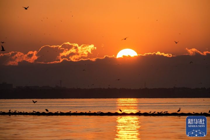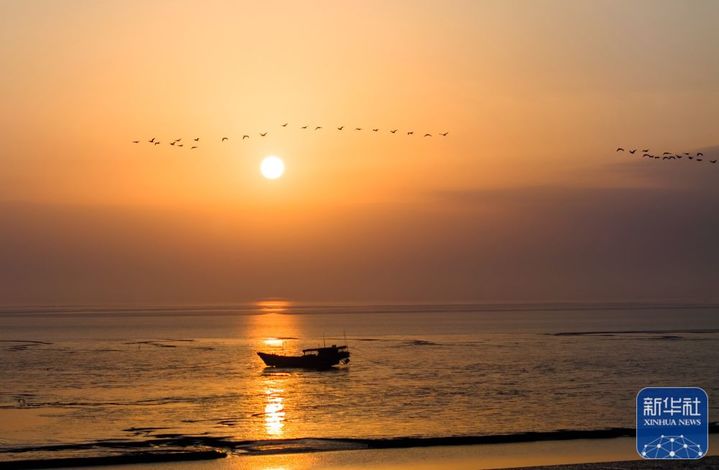 1月1日,在位于江苏盐城的中国黄(渤)海候鸟栖息地(第一期)核心区域东台条子泥海滨,鸟儿迎着朝霞飞翔(1月1日摄,无人机照片)。新华社发 (孙家录 摄)
