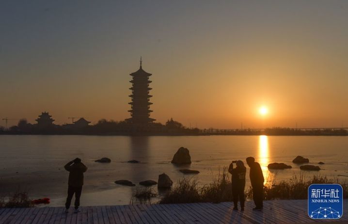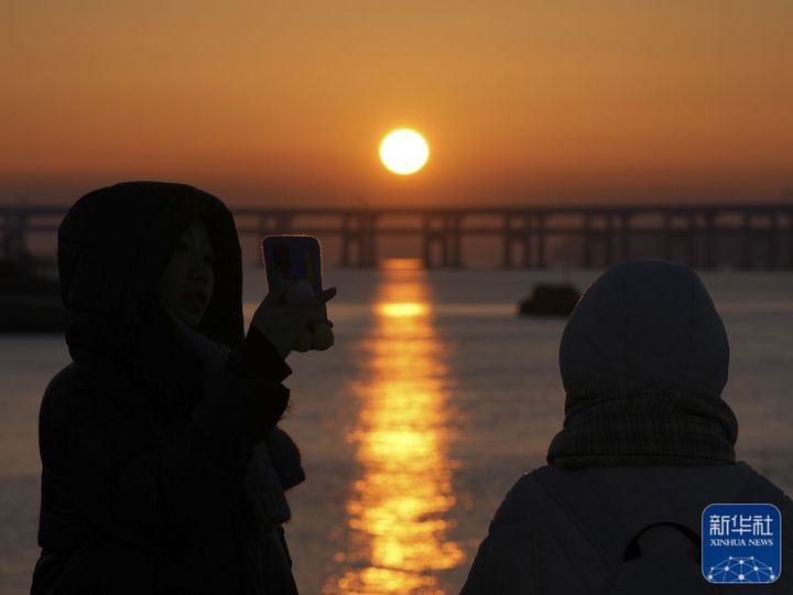 1月1日,人们在山东青岛大沽河省级生态旅游度假区迎接新年日出。新华社发(王昭脉 摄)