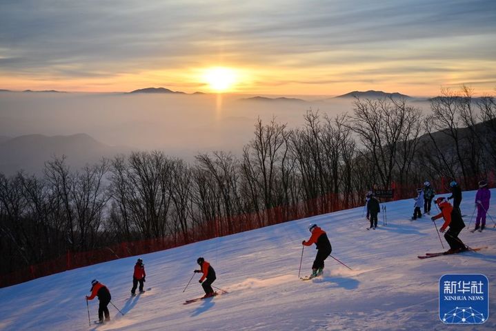1月1日,在吉林省吉林市万科松花湖度假区,滑雪爱好者在晨光下滑雪。新华社记者 颜麟蕴 摄