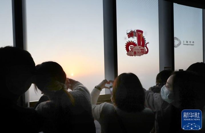 1月1日,市民游客在上海中心大厦顶楼观光厅看日出。新华社记者 方喆 摄