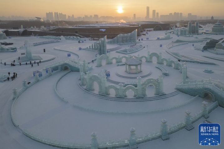 朝阳下的哈尔滨冰雪大世界园区(1月1日摄,无人机照片)。新华社记者 张涛 摄