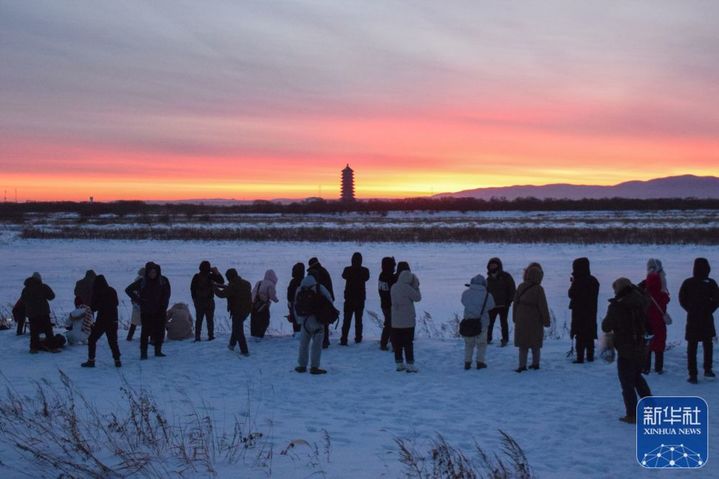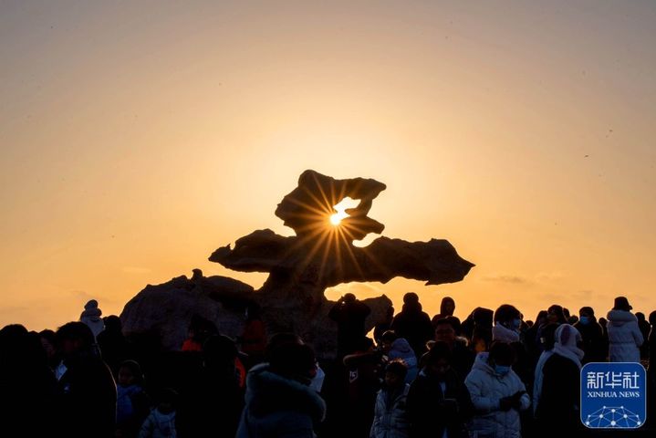 1月1日,游客在黑龙江省抚远市黑瞎子岛上看日出。新华社发(官长青 摄)
