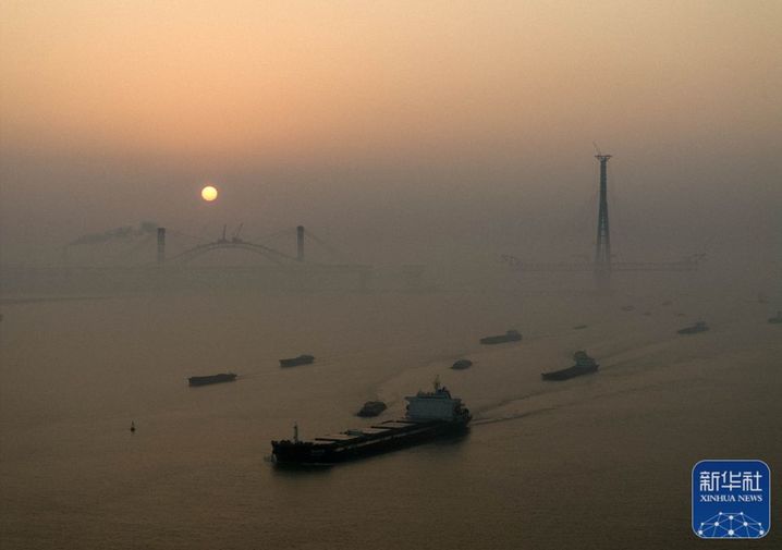 1月1日,船只在晨光中经过位于江苏省泰兴市的常泰长江大桥建设现场(1月1日摄,无人机照片)。新华社发(汤德宏 摄)