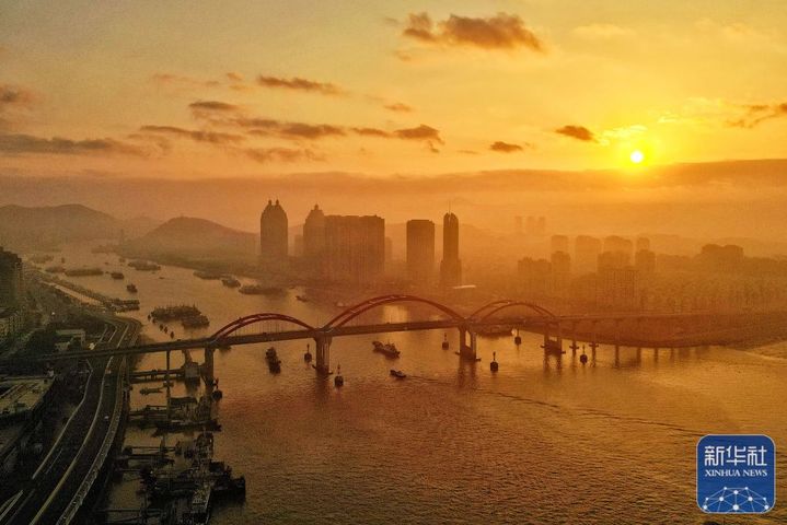 2024年第一缕晨光下的浙江舟山沈家门渔港(1月1日摄,无人机照片)。新华社发(邢守秒 摄)