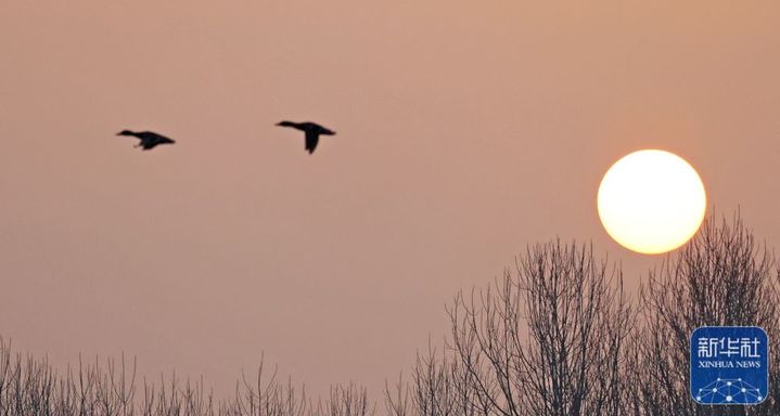 1月1日,在山东省临沂市郯城县,鸟儿迎着晨光飞翔。新华社发(张春雷 摄)