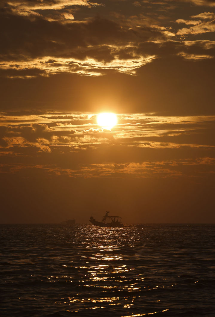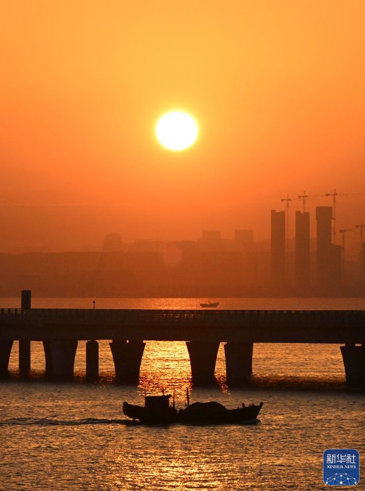1月1日,一条渔船在新年第一缕晨光中从山东青岛胶州湾跨海大桥旁驶过。新华社记者 李紫恒 摄