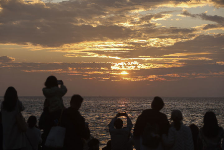 1月1日,人们在山东省烟台市莱山区海滨观赏新年日出。新华社发(唐克 摄)