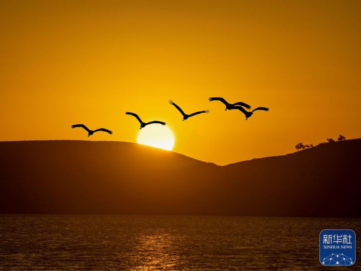 1月1日,在云南省昭通市大山包黑颈鹤国家级自然保护区,国家一级保护动物黑颈鹤正迎着新年的第一缕晨光自由飞翔。新华社发(曾三东 摄)