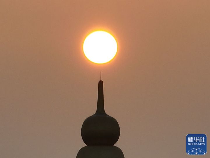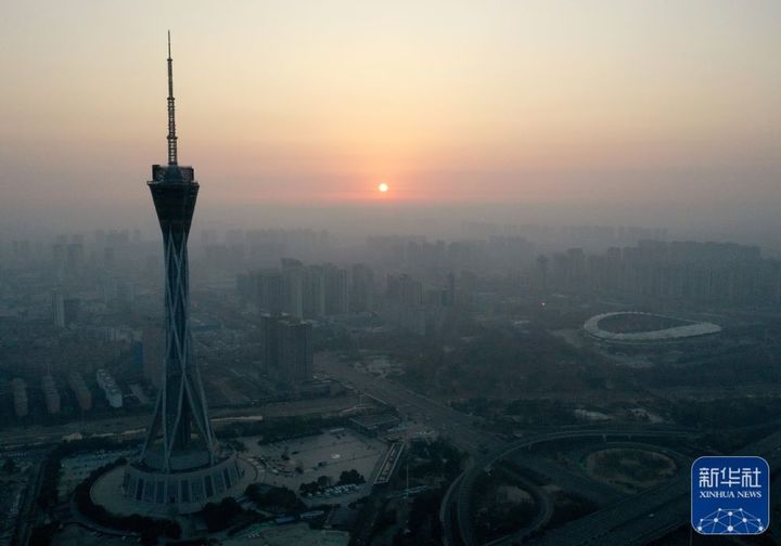 这是1月1日在河南省郑州市中原福塔附近拍摄的日出(无人机照片)。新华社记者 李嘉南 摄
