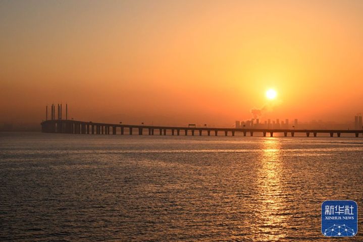 这是1月1日在山东青岛胶州湾跨海大桥拍摄的日出。新华社记者 李紫恒 摄