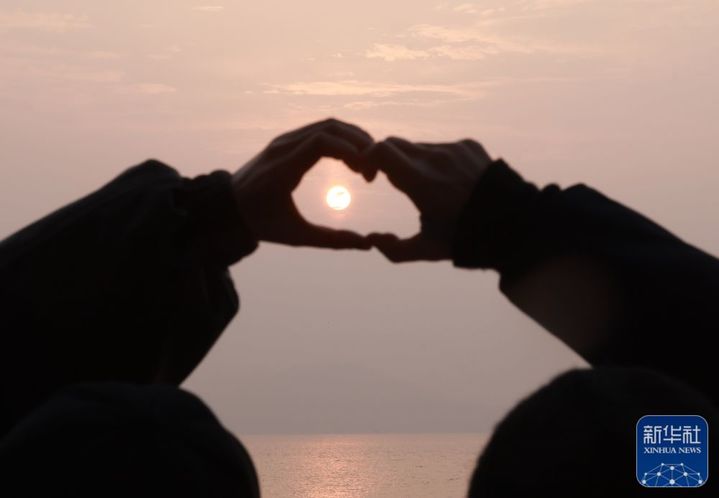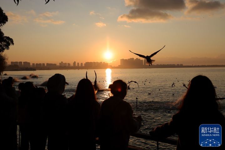 1月1日,在云南省昆明市西山区滇池,人们在观赏新年第一天的日出。新华社发(张正举 摄)
