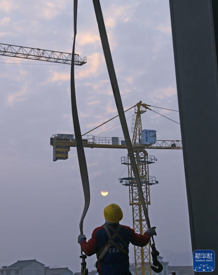 1月1日,工人迎着朝阳在浙江省杭温高铁台州市仙居站项目施工现场进行施工作业。新华社发(王华斌 摄)