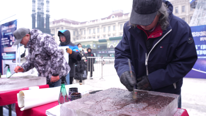 在哈尔滨索菲亚广场举行的“印象索菲亚·冰板画新年”创意跨年活动,为元旦假期营造欢快的节日气氛。活动现场,冰版画创始人朱晓东、黑龙江冰板画艺术联盟副主席盛琰大师等冰版画艺术家们现场创作,为广大游客和市民现场演绎龙江冰雪更多创意玩法。记者注意到,尽管当天气温已达零下20多度,但来自全国各地的幸运游客现场参与热情高涨。“将冰块作为画板进行作画本身已经很震惊了,拓印出来的画幅还兼具美感,真的是一门值得细细品味的艺术,需要很精细的雕刻手法,又有文化创意之美,哈尔滨真的是一座宝藏城市,冰块也能玩出无数花样”。来自河南的张先生在体验冰版画创作后说道。