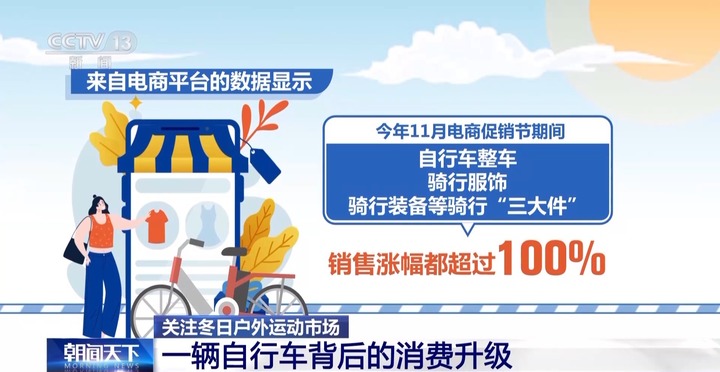 来自电商平台的数据显示,今年11月电商促销节期间,自行车整车、骑行服饰、骑行装备等骑行“三大件”的销售涨幅都超过100%。其中公路自行车暴涨300%、自行车码表及配件增长230%。