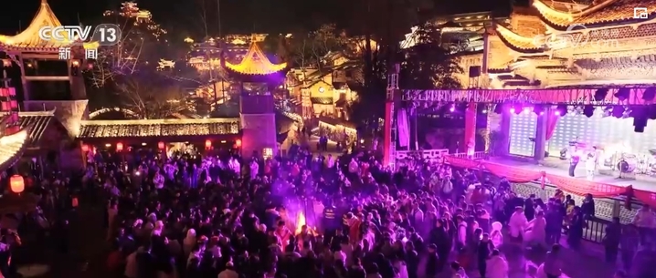 江西各地也举办了多彩的文旅活动,迎接新年的到来。在江西九江,绚丽夺目的国潮灯组吸引不少游客的目光。从锣鼓队迎接仪式到篝火晚会,从摸金豆到玩偶巡游,每一项活动都充满了创意和乐趣。游客们纷纷驻足,在一片欢声笑语中欢度元旦。
