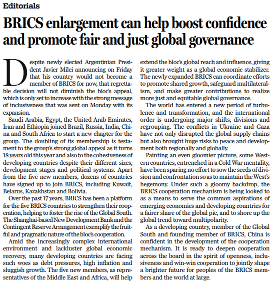 原文标题:BRICS enlargement can help boost confidence and promote fair and just global governance