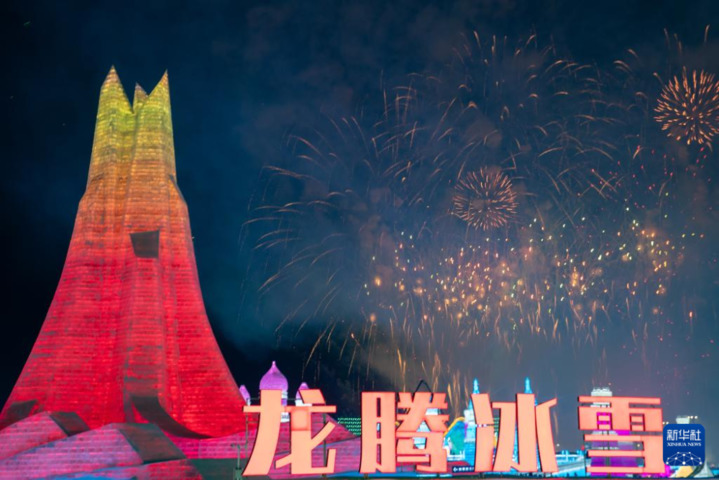 1月5日,冰雪节启幕焰火在哈尔滨冰雪大世界园区上空绽放。当日,第40届中国·哈尔滨国际冰雪节开幕,吸引众多游客。新华社记者 张涛 摄
