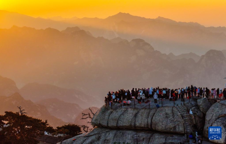 2023年12月31日,游客在位于陕西省渭南市的华山西峰赏景(无人机照片)。元旦假期期间,人们用各种方式乐享时光,迎接新年,欢度假期。新华社发(汪艳 摄)
