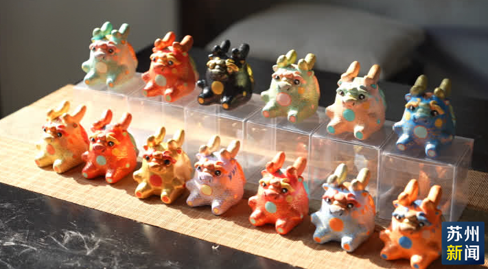 头顶犄角、神情憨态可掬、色彩鲜亮艳丽的龙年泥塑,是苏州泥塑匠人最新创作出的新年伴手礼品,将非遗技艺与传统年俗完美融合。