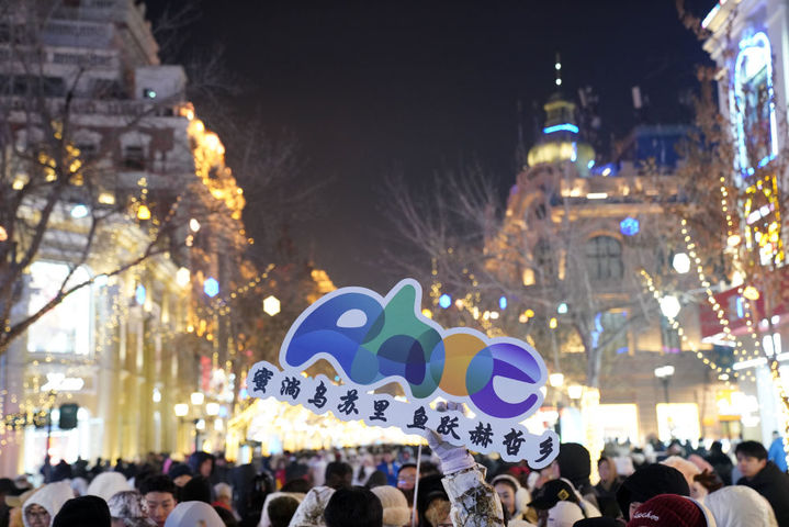 ↑1月6日,一块写着“蜜淌乌苏里 鱼跃赫哲乡”的推介牌出现在哈尔滨中央大街的人流中。