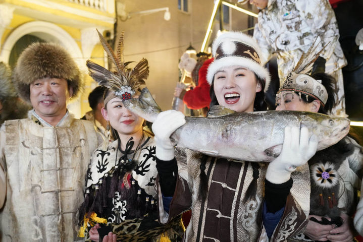 ↑1月6日,身着赫哲族服饰的饶河县文旅推荐官在哈尔滨中央大街上推介家乡特产鱼品。
