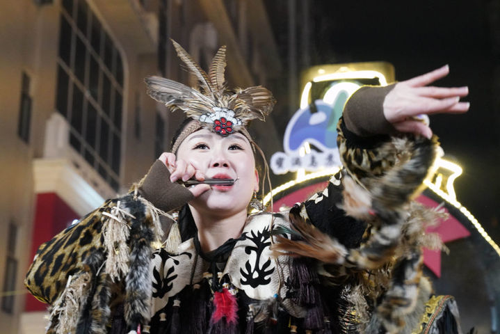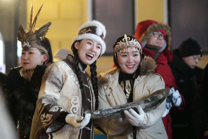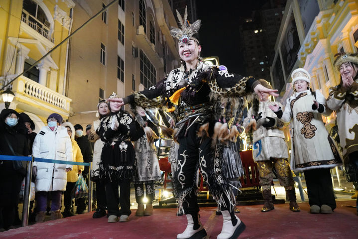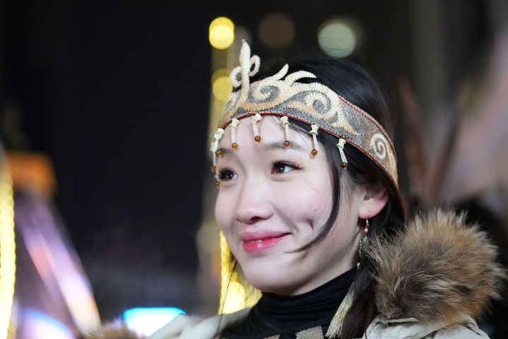 ↑1月6日,戴着鱼皮头饰的赫哲族姑娘在哈尔滨中央大街上参与家乡推介活动。