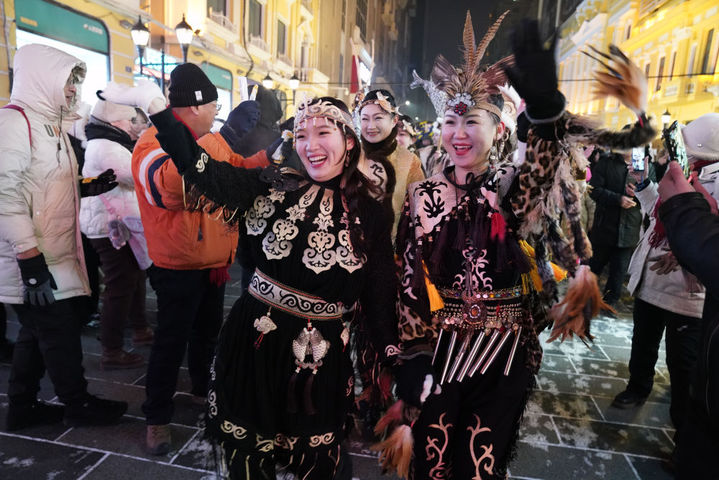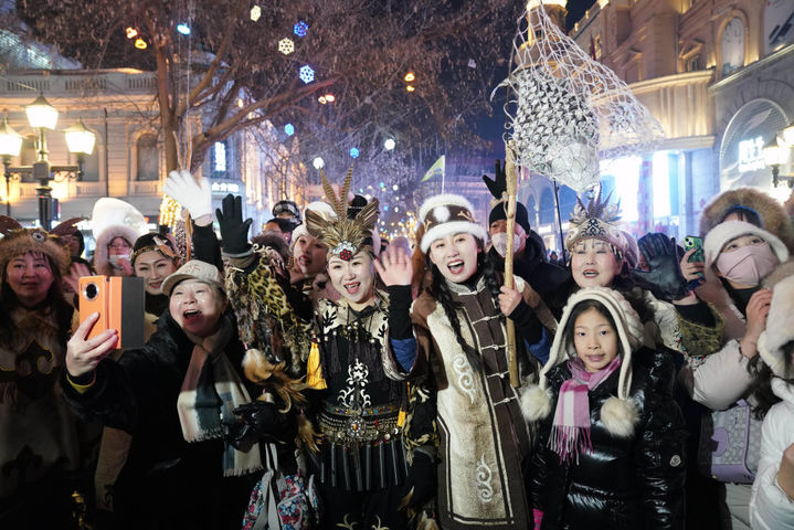 ↑1月6日,身着赫哲族服饰的赫哲族群众在哈尔滨中央大街上与游客互动。