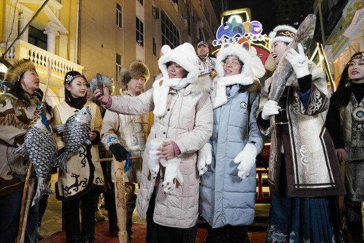 ↑1月6日,身着赫哲族服饰的赫哲族群众和饶河县文旅推荐官在哈尔滨中央大街上与游客互动。