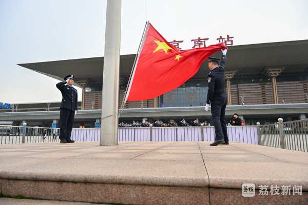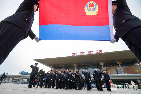 上午9点整,庆祝仪式正式开始。伴随着国旗冉冉升起,全体民警着装整齐列队肃立、向国旗庄严敬礼,表达对党和祖国的深切热爱和赤胆忠诚。“我宣誓,我是中国人民警察...”在南京南站派出所所长侍亚州的领誓下,全体民警高举右拳,面向警旗庄严宣誓,字字铿锵有力,彰显了全体民警对党忠诚、服务人民、执法公正、纪律严明的坚定信念。活动当天,侍亚州代表南京南站联勤联动指挥部,向全体民辅警表示诚挚的慰问和节日的祝贺。