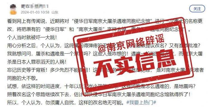 近日,网络上有消息传言“侵华日军南京大屠杀遇难同胞纪念馆更名为遇难同胞纪念馆”,引发一些网民朋友的关注和讨论。