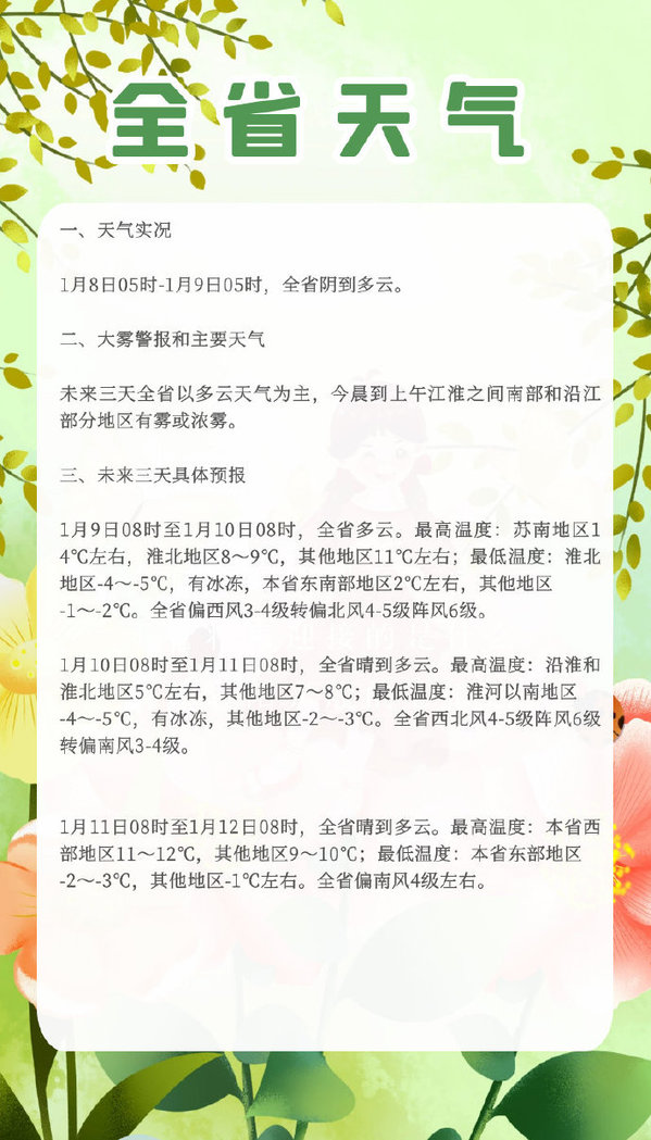 1月9日08时至1月10日08时,全省多云。最高温度:苏南地区14℃左右,淮北地区8~9℃,其他地区11℃左右;最低温度:淮北地区-4~-5℃,有冰冻,本省东南部地区2℃左右,其他地区-1~-2℃。全省偏西风3-4级转偏北风4-5级阵风6级。