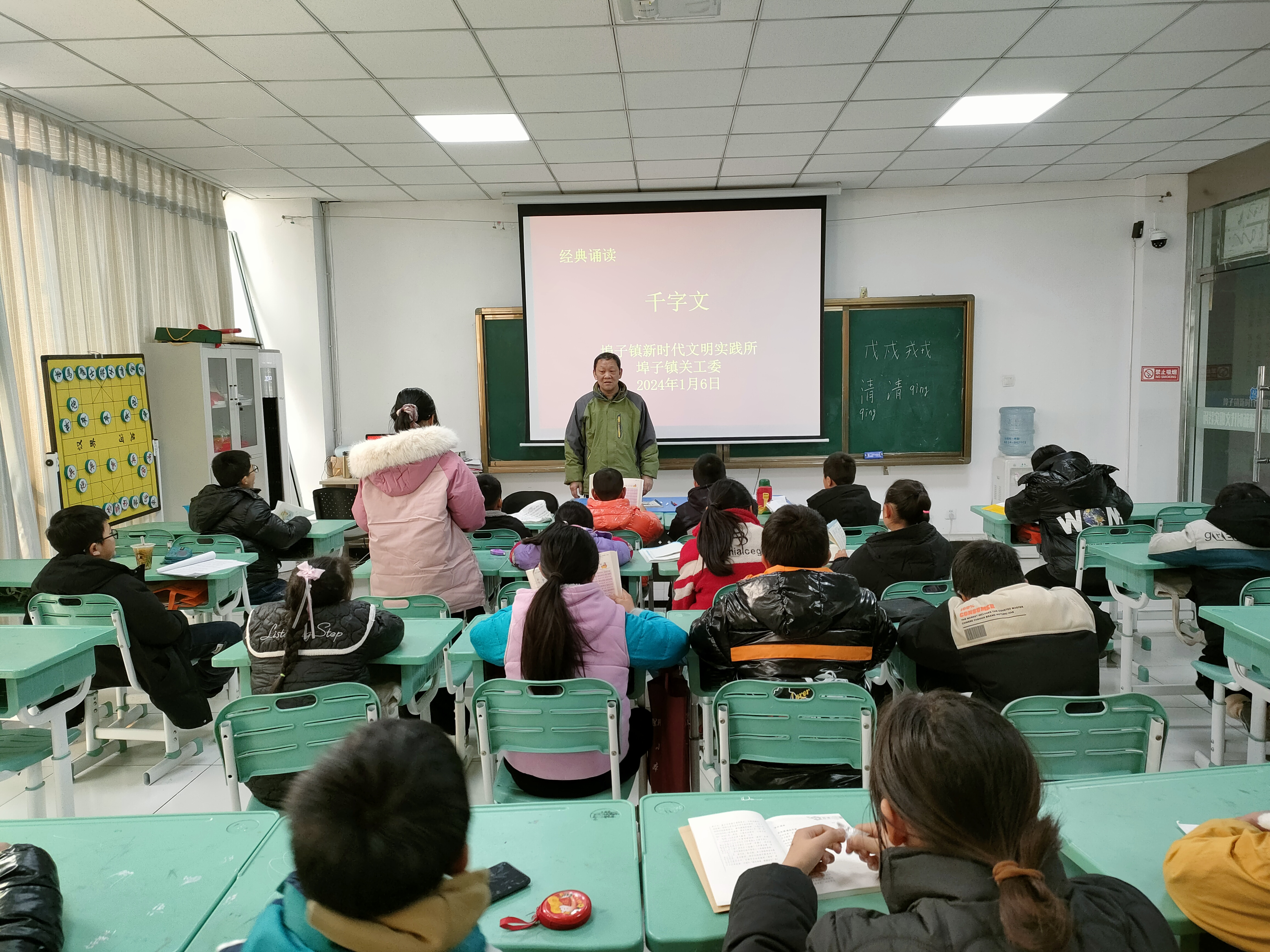 中华经典诗文是我国民族文化的精髓,也是中华文化艺术宝库中的一颗灿烂的明珠。为弘扬源远流长的国学文化,让辖区青少年儿童深刻了解包罗万象的国学经典,1月6日,宿城区埠子镇新时代文明实践所、埠子镇知行学堂组织辖区30余名青少年儿童开展国学经典《千字文》朗诵阅读活动。