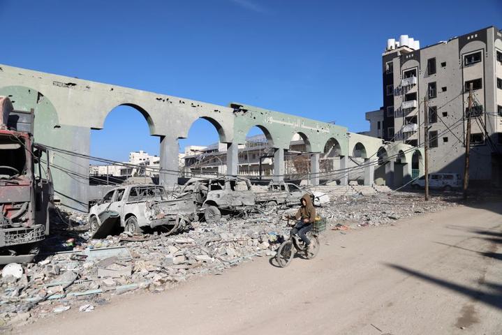 1月7日,巴勒斯坦人骑车经过加沙城的建筑废墟。新华社发(穆罕默德·阿里摄)